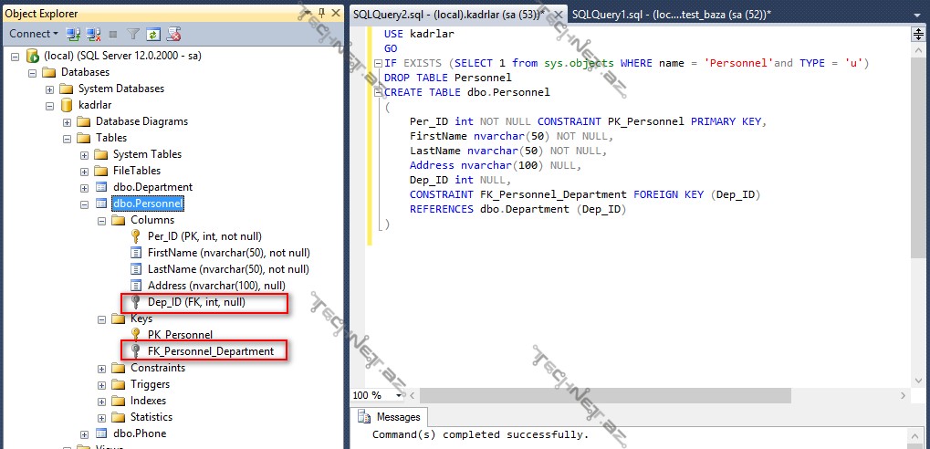 Həmin bazada olan cədvəllərin hər biri ilə ayrı-ayrılıqda işləmək olar; məsələn: Personnel cədvəlindən əməkdaşın ünvanları, adı, soyadı barədə məlumat əldə etmək olar. Lakin elə məlumatlar var ki, iki və ya bir neçə cədvəldən alınır. Məsələn: əməkdaşın çalışdığı departament barədə məlumatı əldə etmək üçün Personnel və Department cədvəlləri arasında əlaqələr yaradılmalıdır. Belə əlaqələrin qurulması üçün SQL – də daha bir məhdudiyyət açarından istifadə olunur: FOREIGN KEY. Adından aydındır ki, cədvəlin özündə deyil, cədvəldən xaric bir açardan (məhdudiyyət qoyulmuş sütundan) söhbət gedir. Bir cədvəldə digər cədvələ aid sütunla bağlılıq əlavə edilir və buna xarici açar deyilir. Istinad olunan xarici sütun aid olduğu cədvəldə unikal açarlardan birinə malik olmalıdır: PRİMARY KEY və ya UNİQUE. Əksər hallarda cədvəllər arasında əlaqələr yaratmaq üçün PRİMARY KEY açar məhdudiyyətindən istifadə olunur. Beləliklə, FOREIGN KEY – digər cədvəldə məlumatların axtarışı üçün istinad kimi istifadə olunan cədvəlin sütunu və ya sütunların birləşməsidir. Cədvəlin FOREIGN KEY xarici açar sütunundaki verilənlər təkrarlana bilər, lakin istinad olunan digər cədvəlin sütunundakı verilənlər təkrarlana bilməz və unikal olmalıdır. Bununla da istinad olunan cədvəldə mövcud olmayan məlumatların cədvələ daxil edilməsinin qarşısı alınır. Yuxarıdakı sxemə diqqət etsək görərik ki, Department cədvəlinin Dep_İD sütunu vardır. Həmin sütuna Department cədvəlində PRİMARY KEY açar məhdudiyyəti təyin olunub. Personnel cədvəlində də eyni adlı sütun görürük. Bu cədvəldəki Dep_İD sütunu Department cədvəlinin Dep_İD sütununa istinad edir və buna görə də Personnel cədvəlinin FOREIGN KEY xarici açarıdır. Bu sütun xüsusi olaraq bu məqsəd üçün öncədən yaradılıb və Department cədvəlindəki sütunla eyni adla adlandırılıb. Lakin bu qayda məcburi deyil və adlar fərqlənə də bilər, sadəcə təcrübəyə əsasən asan anlaşılması üçün belə sütunlar eyni adlandırlır. Personnel cədvəlinin Dep_İD sütununda iki dəfə 1 rəqəmini görürük. Deməli, həmin sətirlərdəki verilənlər Department cədvəlinin Dep_İD sütununun 1 rəqəmi olan sətrinə istinad edir. Lakin biz Personnel cədvəlinin Dep_İD sütununa 1, 2, 3, 4, 5 rəqəmlərdən başqa rəqəm, məsələn 7 rəqəmini əlavə etmək istəsək bunu edə bilməyəcəyik və VBİS Department cədvəlinin Dep_İD sütununda həmin verilənlərin mövcud olmaması barədə bizə səhv mesajı verəcək. Bununla da cədvəllər arasında əlaqə bütövlülüyü (referential integrity) təmin edilir.
