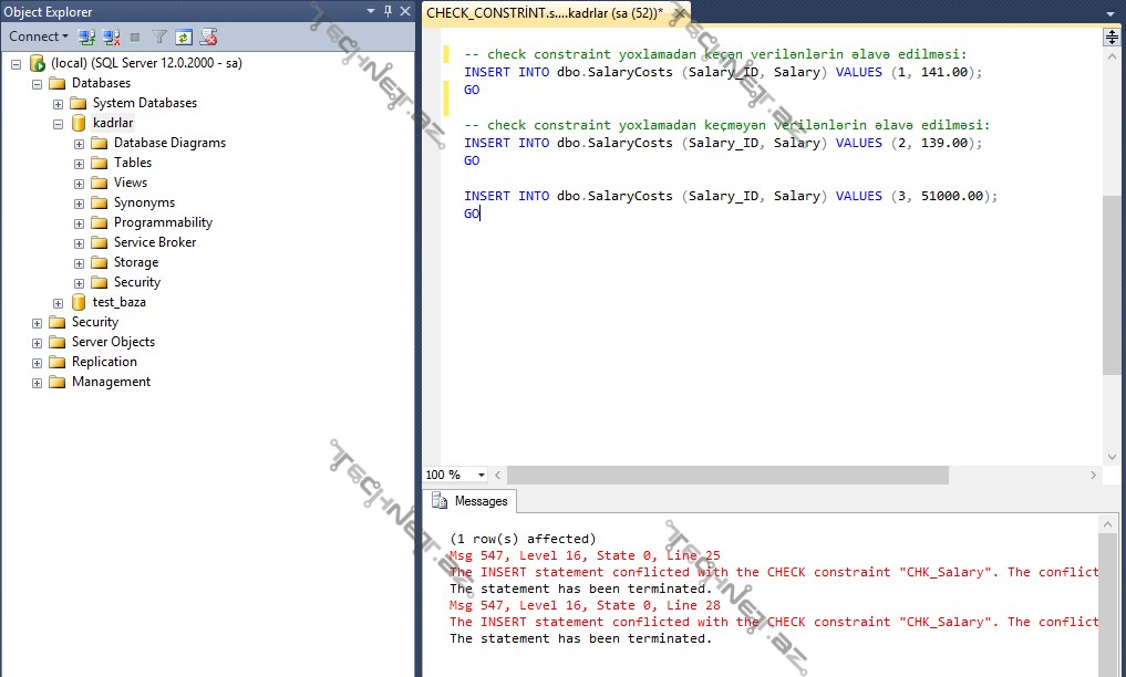Daxil etdiyimiz 51000,00 manat CHECK məhdudiyyətinə görə yoxlamadan keçməyəcək və Microsoft SQL Server əmrin icra olunmadığı barədə yuxarıda göstərilən səhv mesajı çıxaracaq. Alınan nəticəyə baxaq: