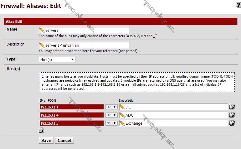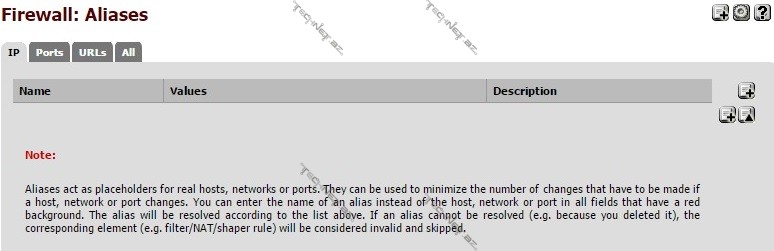 Aliases – qayda yaradılmasını sadələşdirmək üçün IP, Port, Network, URL ünvanlarını qruplaşdırmaq üçün istifadə olunur. Məsələn icazə veriləcək portları və ya IP ünvanlarını bir qrup altında birləşdirərək, tək bir qayda ilə bu seçilmişlərə icazə tətbiq etmək mümkündür. “+” işarəsini sıxaraq yeni bir qrup yaradaq.