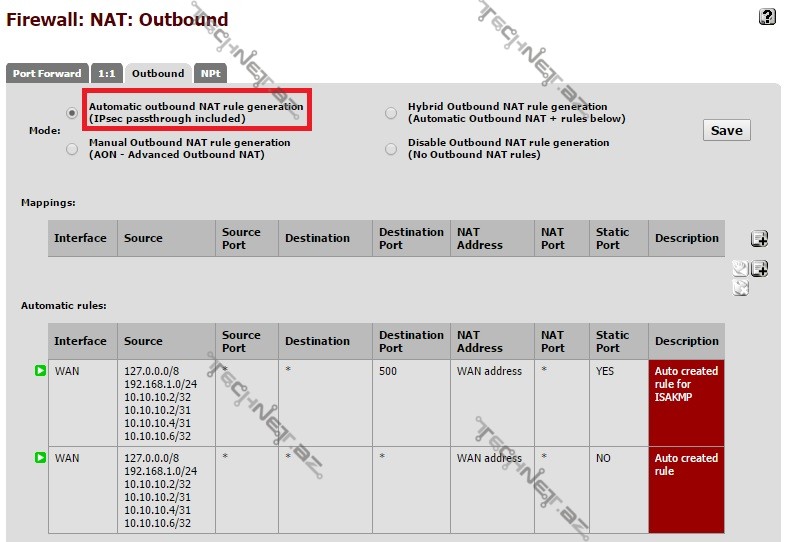 “PfSense” qurulduğu zaman bu bölmədə “Automatic outbound NAT rule generation” seçilmiş halda olur. Yəni “Outbound” sazlamaları avtomatik olaraq tənzimlənir. Bir neçə public IP ünvanımız varsa, və ya iki və daha artıq WAN interfeys istifadə ediriksə, bu tənzimləmələri tələblərə uyğun şəkildə həyata keçirə bilərik. “Mode” bölməsində “Manual Outbound NAT rule generation” və ya “Hybrid Outbound NAT rule generation” seçimləri ilə bu rulları istədiyimiz kimi dəyişə bilərik. “Manual” seçdiyimiz zaman avtomatik yaradılmış olan qaydalar üzərində dəyişiklik etmək və yeni qaydalar yaratmaq imkanına da sahib oluruq. “Hybrid” seçimində isə avtomatik yaradılmış qaydalarla yanaşı tələblərə uyğun yenilərini də əlavə edə bilərik. Bu yönləndirmələr üçün Virtual IP istifadə etmək mümkündür.