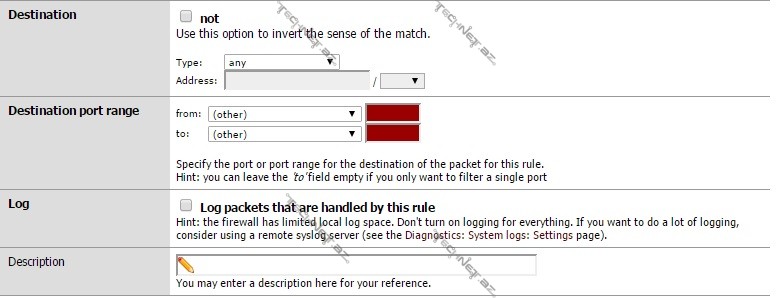 Destination port range – Hədəf port aralığı. Siyahıdan uyğun port aralığını seçə, “any” deyərək bütün portlara və ya “other” deyərək “Aliases” bölümündə yaratmış olduğumuz port qrupunu əlavə edə bilərik.