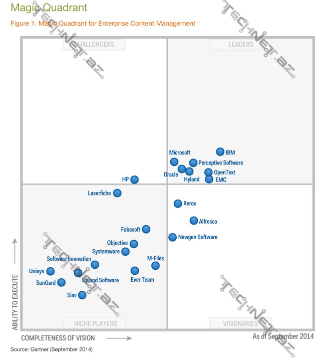 “Gartner”-in 2014-cü il üçün hazırladığı “Magic Quadrant for Enterprise Content Management” hesabatına görə dünyada aşağıdakı ECM sistemlərinin istehsalçıları liderlərin siyahısındadır: