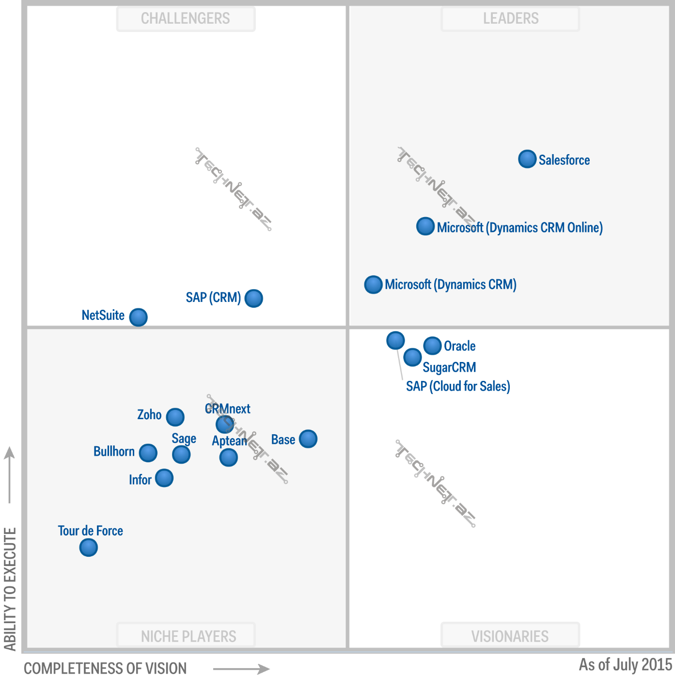 “Gartner”-in 2015-cü il üçün hazırladığı “Magic Quadrant for Sales Force Automation” hesabatına görə dünyada aşağıdakı CRM sistemlərinin istehsalçıları liderlərin siyahısındadır: