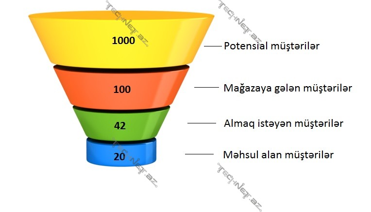 Göründüyü kimi yuxarıdan aşağıya doğru müştərilərin sayı azalır və sonda real alıcı olan müştərilər qalır. Müştərilər bir növ süzgəcdən keçirilərək, potensial müştəridən kassaya pul ödəyən müştəriyə çevrilir. Göründüyü kimi hər mərhələdə müştərilərin sayı azalır. Mağazaya cəmi 100 nəfər müştəri gəlir və beləliklə biz 900 potensial müştərini itiririk. Daha sonra mağazaya gələn müştərilərin 58 faizi mebel almamış çıxıb gedir. Faktiki biz bunları da itiririk. Sonda cəmi 20 nəfər müştəri qalır. Bu sadə misaldan görə bilərik ki, hər mərhələdə nə isə baş verir. Hər bir şirkətin müxtəlif mərhələlərdən ibarət belə qrafı ola bilər. Müştərilərin azalma səbəblərini faktiki olaraq bilmirik. Belə problemlərin aradan qaldırılması və hər mərhələdə nə baş verdiyini analizi üçün CRM sistemləri yaradılmışdır. Həmin sistemlər vasitəsilə bütün müraciət edən müştərilərin vahid bazasını yaratmaq, satış menecerlərə xəbərdarlıqlar etmək, telefon danışıqları qeydə almaq, satış menecerlərin işini analiz etmək, onların reytinqini qurmaq, imtinaların analızını aparmaq və s. işləri görmək olar. Bununla da hər mərhələdə faizlərin artırılmasına nail olmaq olar. Məsələn: satış menecerlərinin işini analız etməklə 100 nəfərdən 58 -in niyə daha yaxından maraqlanmaması və mebellərə baxmamış çıxıb getməsi səbəblərini bilmək olar. İmtinaları analız etməklə, maraqlanan müştərilərin mağazadan mal almamış çıxıb getməsi səbəblərini bilmək olar. Həmin səbəblərə, məsələn: mebelin qiyməti, rəngi, forması və s. yenidən baxdıqdan sonra məhsul alan müştərilərin sayını artırmaq olar.