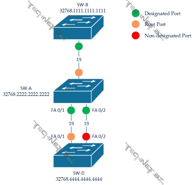2 bayt (16 bit) olan Bridge Prioritet göstəricisi 0-65535 aralığından seçilə bilər və default olaraq 32768 kimi təyin olunur. Bridge İD-də istifadə olunan MAC ünvan switch-in hansısa portdan öyrəndiyi MAC deyil, istehsalçısı tərəfindən təyin olunmuş göstəricidir. Switch-lər arasında Bridge İD-si ən aşağı olan Root Bridge seçilir. Misal üçün qeyd olunan topologiyada SW-B daha aşağı Bridge İD-yə malik olduğuna görə Root Bridge seçiləcəkdir və SW-B-nin portları designated kimi təyin olunacaqdır. Bu o deməkdir ki, switch-in portları məlumat ötürülməsində aktiv olaraq iştirak edir. Qeyd etmək lazımdır ki, Root Bridge-in bütün portları designated rolunda olur.