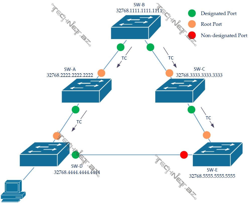 Aşağıdaki şəkildə kompüter qoşulduqda SW-D tərəfdən həmin proses başlayır. Maraqlısı odur ki, burada hansı dəyişiklin baş verdiyi söylənilmir, yəni Root Bridge sadəcə dəyişikliyin olduğu barədə məlumatlanacaqdır, konkret olaraq hansı switch-də nəyin dəyişdiyi barədə deyil.
