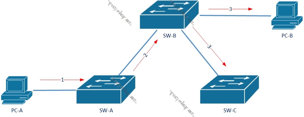 - ARP sorğusu broadcast olduğu üçün SW-A bu məlumatı qəbul edib SW-B və SW-C-yə otürəcəkdir.