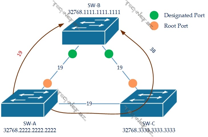 Birdən çox seçim olduqda Bridge İD-dəki kimi ən aşağı dəyəri olan yol seçilir. Bizim misalda bütün portların 100Mb/s olduğunu nəzərə alsaq, Root port, başqa sözlə desək seçilmiş Root bridge-ə ən yaxın yolu seçmək üçün SW-A mövcud iki yolu dəyərləndirməlidir. Burada birbaşa olan qoşuntunun dəyəri 19-dur, SW-C üzərindən olan qoşuntunun isə dəyəri 38-dir. 19 dahra aşağı olduğu üçün SW-A həmin portu Root Port kimi təyin edəcək. Bu prosesin eynisini SW-C etməklə öz Root Portunu təyin edir.