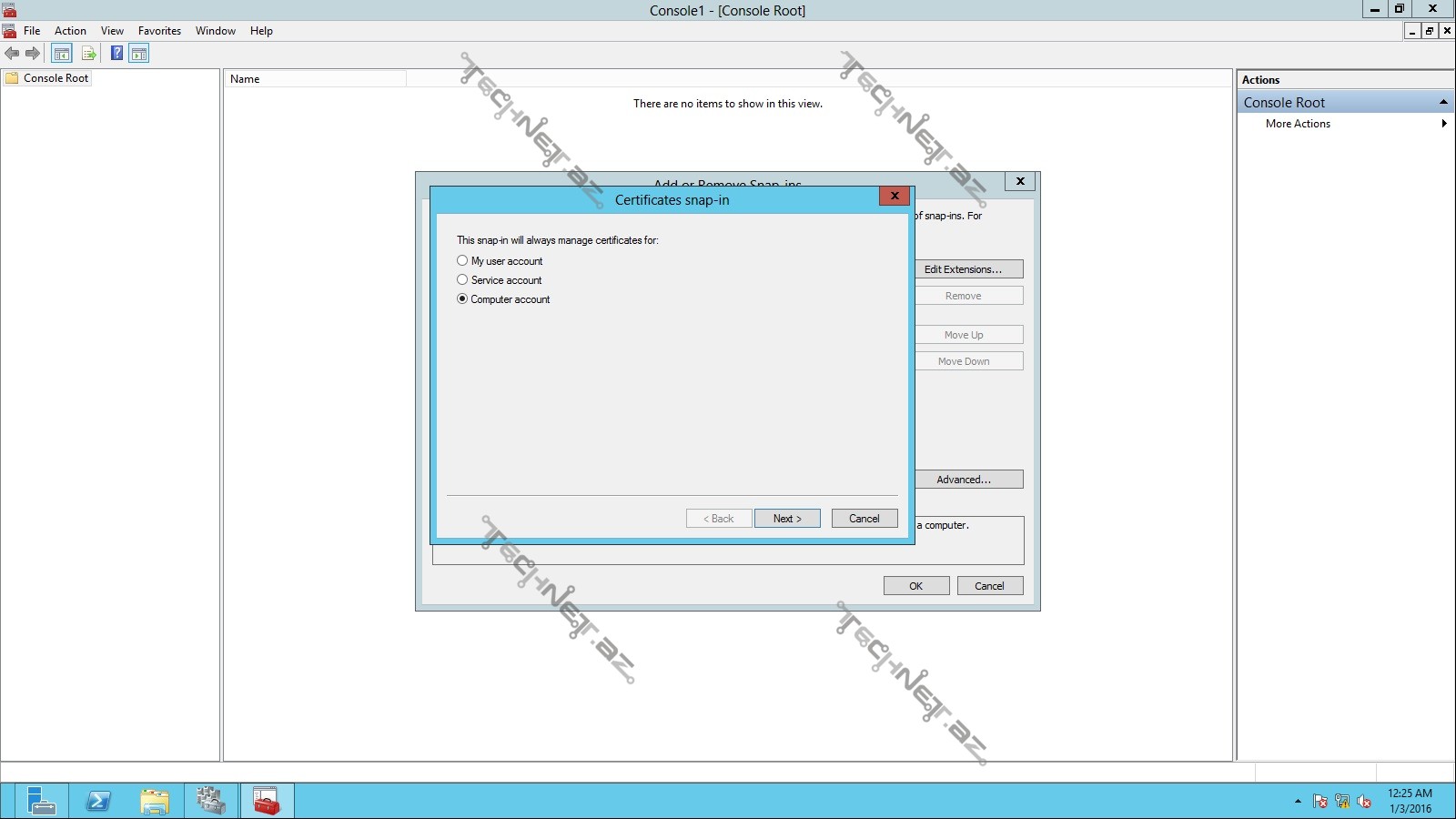Microsoft Management Console (mmc) daxil oluruq (Run da mmc yazıb OK vururuq). Açılan pəncərədə File dan Add/Remove Snap –ı seçirik: