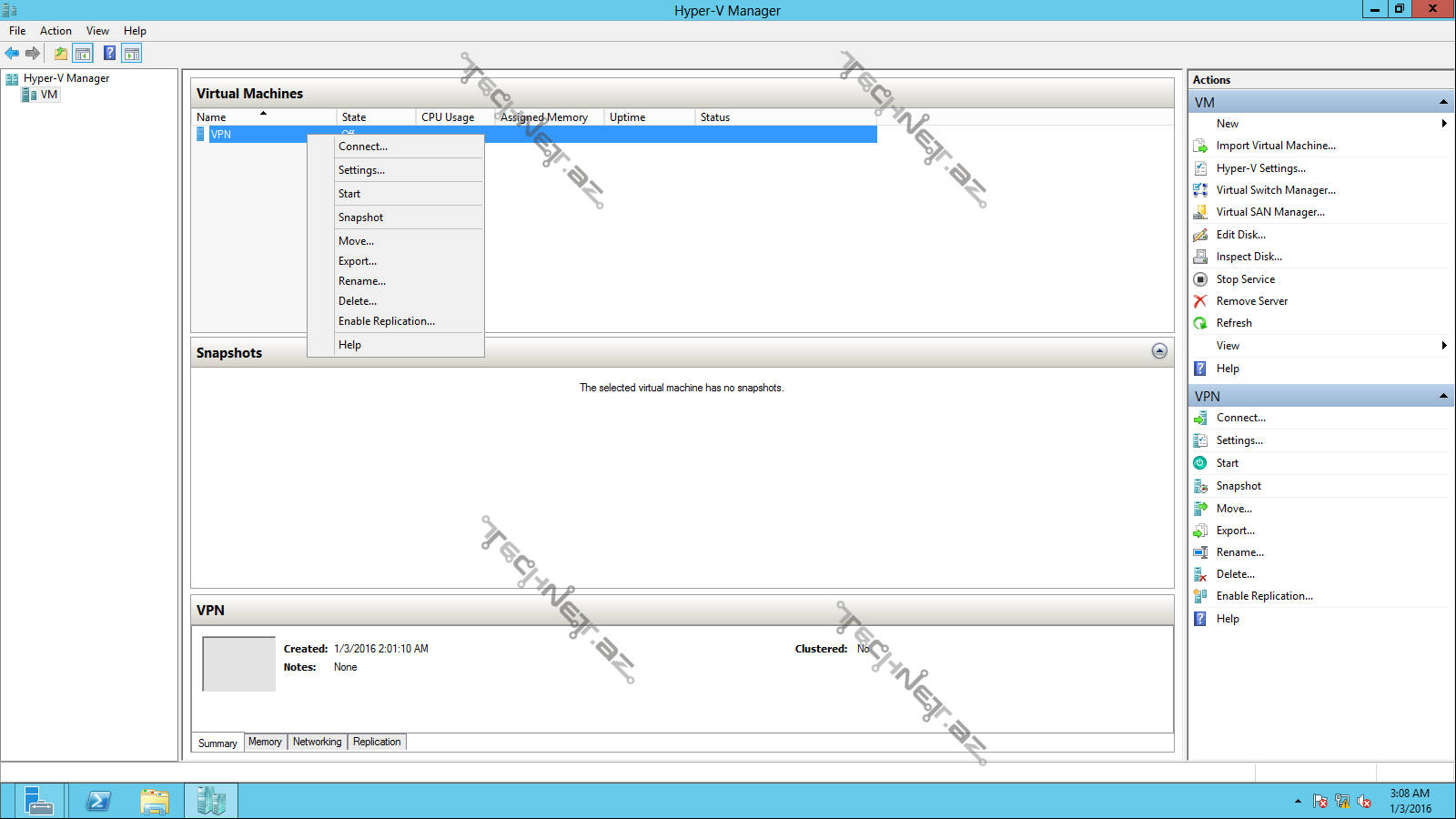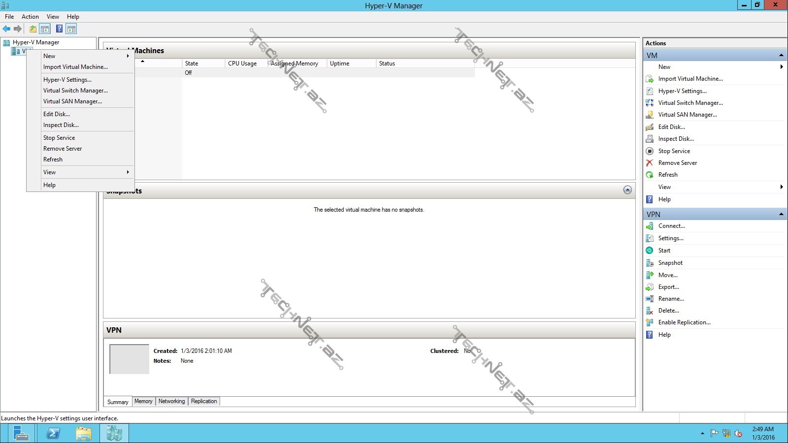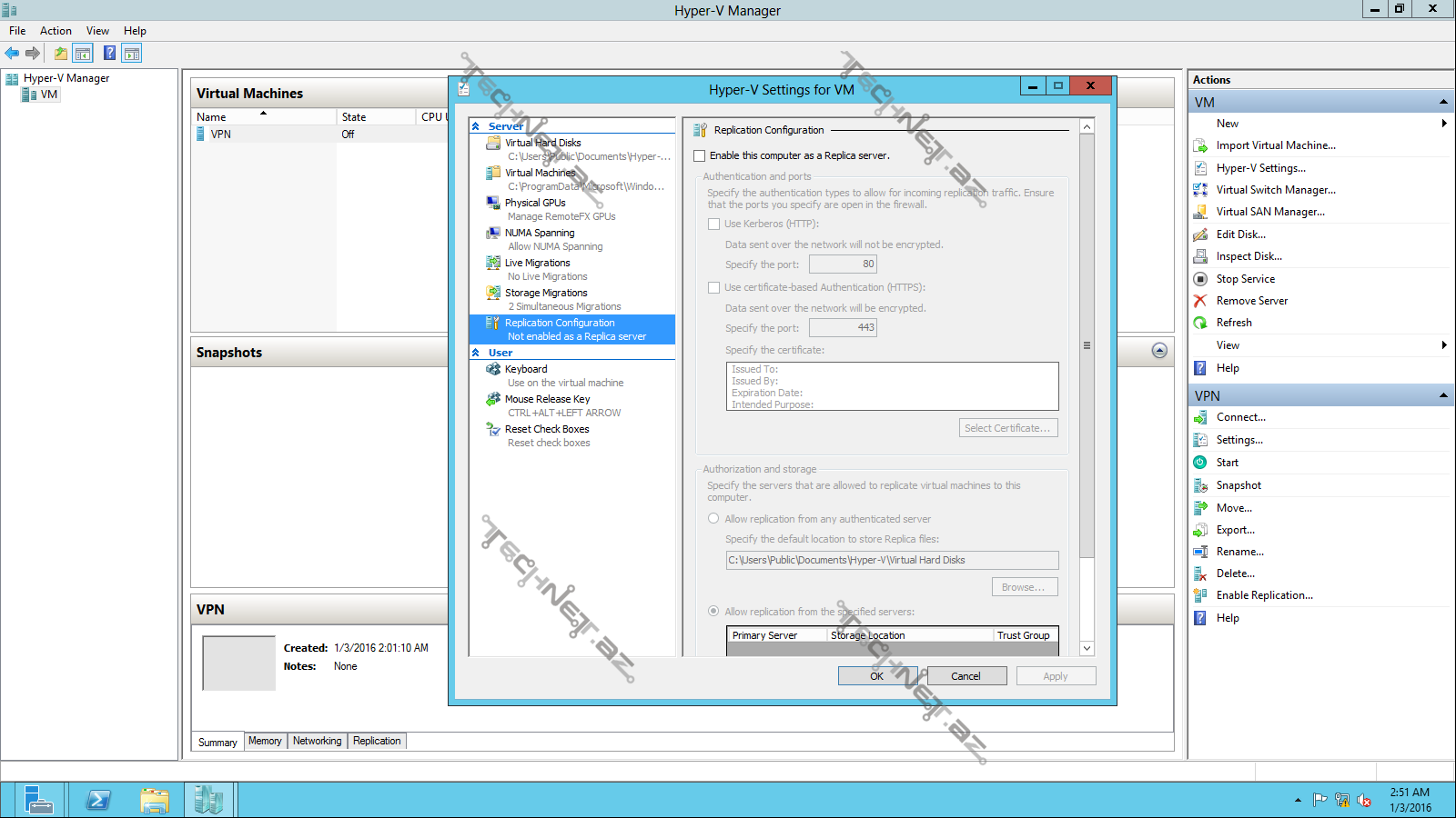 İndi VM Serverində olan VPN Hyper-V –i Cluster üzərində replication etməyə çalışaq. Enable Replication deyirik: