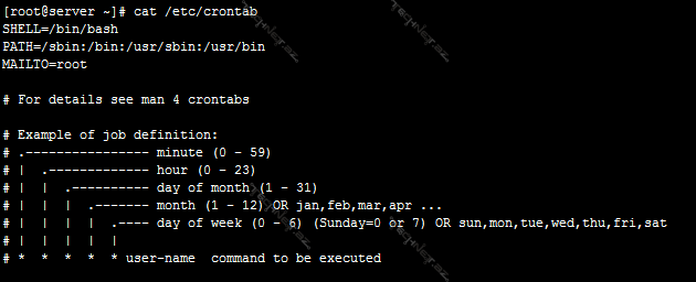 Crontab fayli /etc direktoriyası altında yerləşir.cat əmri ilə faylın içinə baxdıqda nümünə olaraq necə istifadə olunmasını göstərilib.