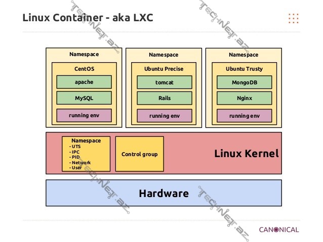Containers (Konteynerlər) – Unix/linux aləmi üçün container-lər yeni mövzu deyil. Əvvəllər də BSD Jail, LXC(Linux Containers) və s. oxşar texnologiyalar istifadə olunub. Linux containers (LXC) – əməliyyat sistemi səviyyəsində virtuallaşdırma metodu olub çoxlu sayda izolyasiya edilmiş linux sistemlərinin(containers) control host (LXC host) üzərində işləməsini təmin edir.