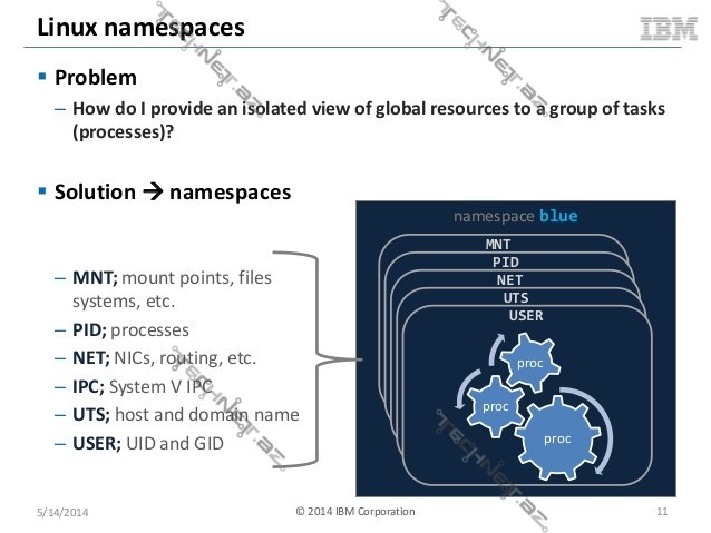 Container-in hər bir funksionallığı ayrıca yaradılmış namespace daxilində işləyir və işləmə səlahiyyətləri həmin namespace çərçivəsində məhdudlaşdırılır. Namespace global system resurslarını abstraktlaşdıraraq namespace daxilində olan proseslərə global resursların izolyasiya olunmuş instansı kimi təqdim edir. Dəyişikliklər namespace-in üzvü olan proseslər tərəfindən görünür, lakin digər proseslər bunları görmür. Misal üçün process səviyyəsində izolyasiya olunaraq container daxilində işləyən web proqram təminatınının, xidmətin, istifadəçinin hesabının kənardan əldə edilməsi ilə sistemə müdaxilə yalnız həmin container daxilində keçərlidir və digər containerlər və əməliyyat sistemi üçün təsirsizdir. Docker container üçün yeni namespace yaradaraq onun file sisteminin, adının, istifadəçilərinin, şəbəkə strukturunun və proseslərinin yerdə qalan sistemdən izolyasiyasını təmin edir. Pid, net, ipc, mnt, uts, usr namespace-ləri istifadə olunaraq uyğun olaraq proseslər, şəbəkə, proseslər arası qoşulma, istifadəçilər, ad, domain adı və s. izolyasiya olunur.