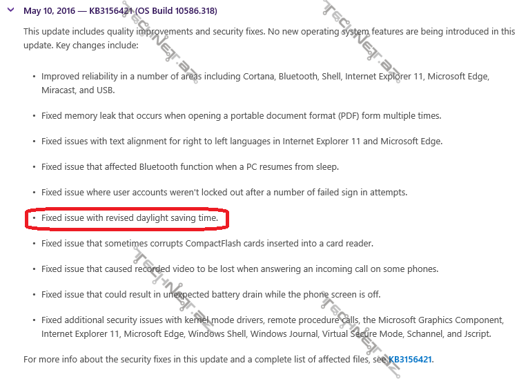 Uyğunsuzluğun mərkəzləşdirilmiş qaydada Windows yeniləmələri (Windows Update) vasitəsi ilə aradan qaldırılması üçün Microsoft Korporasiyasına aidiyyəti məsələ üzrə müraciət edilmiş və qısa müddətdə müvafiq yeniləmə hazırlanaraq 10 May 2016-cı il tarixində istifadəçilərə təqdim edilmişdir. Bu təlimatdan istifadə etməklə həmin yeniləməni quraşdırmaq, beləliklə də Yay vaxtına keçid və ya onun ləğv edilməsi ilə bağlı uyğunsuzluğu müvafiq qərara əsasən tamamilə həll etmək mümkündür.