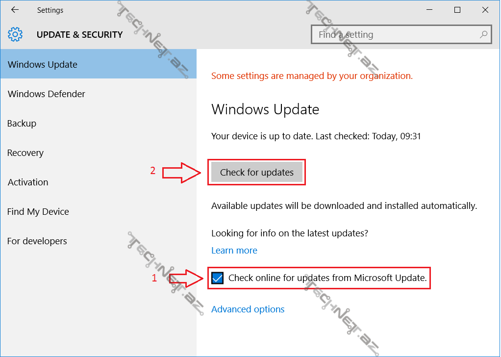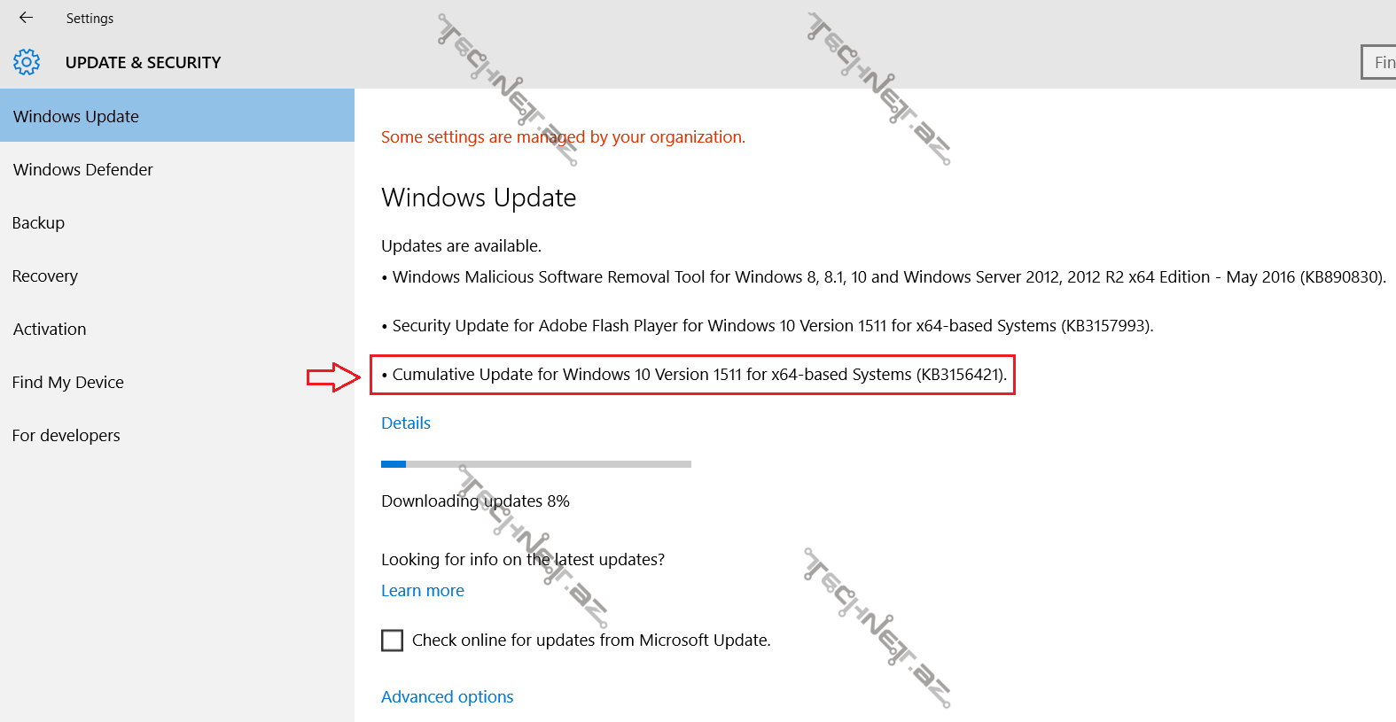 Yeniləməni quraşdırmaq üçün internetə qoşulu olduğunuza əmin olduqdan sonra START -> SETTINGS -> UPDATE & SECURITY bölməsində yeniləmələri yoxlamaq üçün Check for updates düyməsini basın. Əməliyyat sistemi müvafiq yeniləmələri tapıb sizin kompüterə quraşdırmağa başlayacaq. Əgər tapmazsa, onda Check online for updates from Microsoft Update seçərək, yenidən cəhd etməyinizi tövsiyə edirik. Lazım olan yeniləmə “Cumulative Update for Windows 10 … (KB3156421)” adlanır: