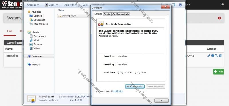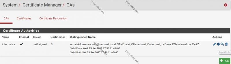 “Https interception” aktivləşdirmək üçün ilk əvvəl pfsense üzərində squid-in istifadə edəcəyi sertifikat yaradılmalı və istifadəçilərə yüklənməlidir. “System->Cert. Manager” yolunu izləyib “CAs” başlığı altında “+Add” düyməsini sıxaraq yeni sertifikat yaradırıq.