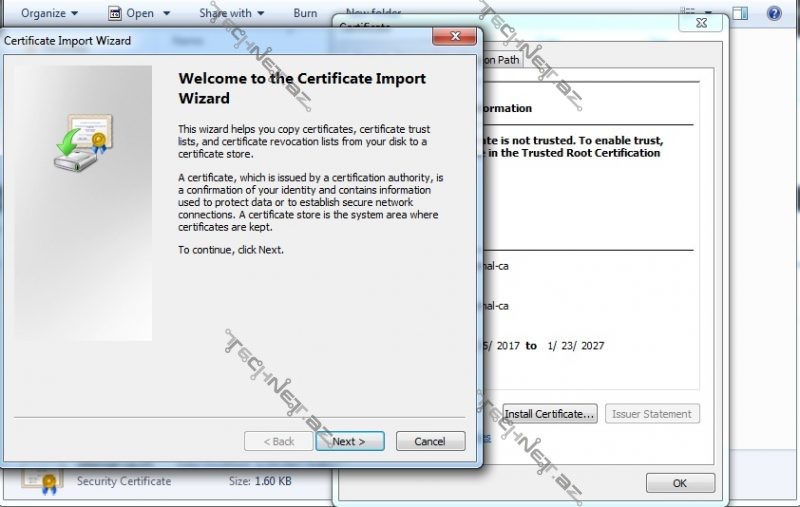 Yaratmış olduğumuz sertifikatı adının qarşısındakı uyğun işarə ilə export edirik. Daha sonra istifadəçi komputerlərinə yükləyirik. Ardıcıllıq aşağıdakı şəkillərdə göstərilmişdir.