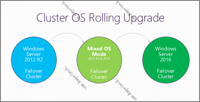 Şəkilə diqqət etdiyimiz zaman dədə-baba dövründən davam edən Failover Clustering xidməti üçün eyni əməliyyat sistemi məhdudiyyəti artıq aradan qaldırılıb. Belə ki, mövcud Cluster daxilində WinSrv 2012 R2 və Server 2016 fəaliyyət göstərə bilir. Və bu imkan vasitəsilə biz 2012 R2 üzərində çalışan Hyper-V maşınlarını Server 2016 üzərinə canlı daşıyaraq (Live Migration) digər Hostları da yeni sistemə yüksəltmə imkanını qazanmış oluruq. Burdakı proses in-place upgrade deyil, Hostların cluster mühitindən çıxarılaraq normal şəkildə tövsiyə olunan fresh install vasitəsilə sistemlərinin yenidən qurulub Cluster mühitinə daxil olunması nəzərdə tutulub.