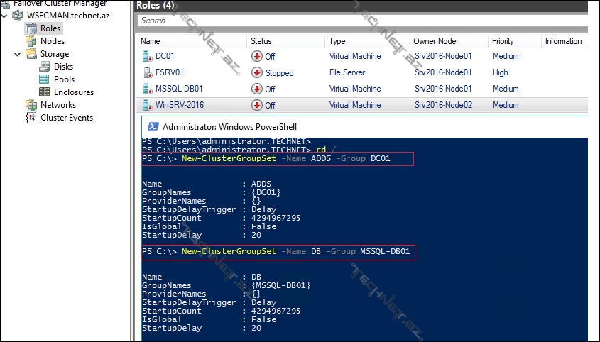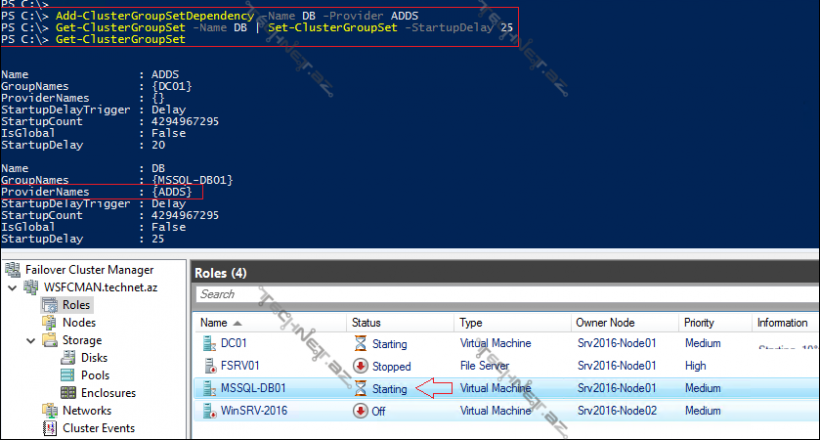b) Əmrlərin icrası tamalandıqdan sonra sınaq üçün MSSQL-DB01 Serverini başlatdığınız zaman diqqət edəcəksiniz ki, DC01 sönülü olsa da avtomatik olaraq açılış moduna keçəcək. Bunun səbəbi Add-ClusterGroupSetDependency əmri ilə MSSQL-DB01 -i bir növ DC01-in açılış vəziyyətindən asılı hala gətirmiş olmağımızdır.