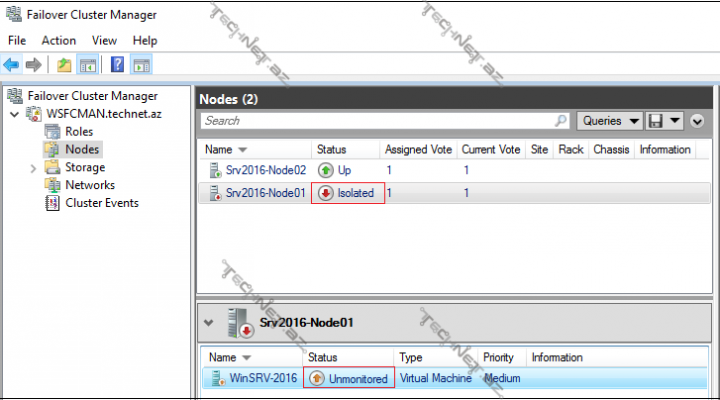 a) Cluster servisini (clussvc.exe) kill etdiyimiz zaman aşağıdakı nəticə ilə qarşılaşacağıq. Cluster servisində nasazlıq yaşanan Host avtomatik olaraq Isolated moda keçirilərək aktiv üzvlükdən arındırılmış olur. Lakin Host VM-lar üçün xidmət göstərməyə davam edir və VM-lar bu müddət ərzində Unmonitored modda fəaliyyətini davam etdirirlər.
