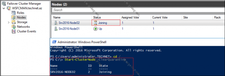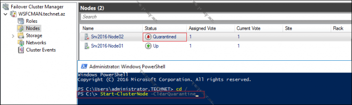 f) Manual müdaxilə üçün Start-ClusterNode -CQ əmrindən yararlanaraq Nodu yenidən aktiv mühitə daşıya bilərik.