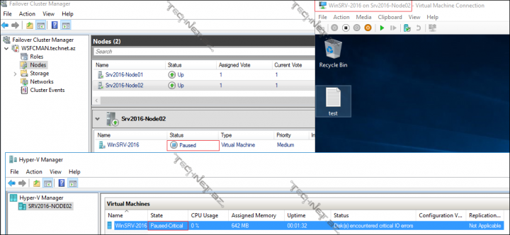 g) CSV (Cluster Shared Volume)-la bağlı yaşanan ani kəsintilərdə (FC/FCoE/İSCSI/SAS) VM-lər Paused-Critical moda daşınaraq VM-lərin crash olma riski minimallaşdırılmışdır. Sınaq üçün arxa planda fəaliyyət göstərən İSCSI Storage-i restart edərək belə bir nəticə əldə edə bilərik :).