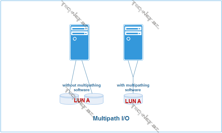 d) MPIO (Multipath I/O) – MPİO-nu NİC teaming-ə bənəzədə bilərik. Default olaraq Windows Server ƏS-ləri üzərində mövcud olan bu xüsusiyyətin bizim üçün faydası nədir ?. Xidmət kəsintisini minamallaşdırmağı hədəflədiyimiz üçün Server və Storage arasında kəsinti yaşanmasın deyə serverlər üzərinə bir neçə HBA əlavə edə bilərik. Bu zaman Storage tərəfində yardacağımız LUN-ları hər iki HBA üzərindən serverlərə göndərməliyik. İki HBA və yaxud yuxarıdakı şəkildə gördüyünüz kimi iki portlu HBA üzərindən LUN-lar Nodlara göndərilən zaman sistemdə iki ədəd disk yaranacaq. Reallıqda isə bu bir ədəddir. Bu tip problem yaşanmasın deyə MPİO aktivləşdirilməldir. Təbii olaraq MPİO-nu bu qədər bəsitləşdirə bilmərik. Bu xüsusiyyət vasitəsilə eynilə NİC teaming-də qazandığımız Fault Tolerance və Load balancing və s. kimi əsas imkanlarıda qaznmış olacağıq (əslində hədəf budur).