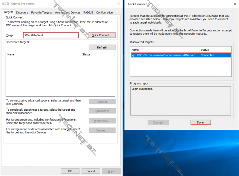 3. Sürətli şəkildə bağlantını təmin etmək üçün bir başa Targets bölməsindən İSCSİ-Target Server in ip adresini daxil edərək Quick Connect düyməsini sıxırıq. Əgər İSCSİ-Target Server üzərində LUN-ların tənzimlənməsində və serverlərə tanıdılmasında hər hansı bir səhvə yol verilibsə, sağ tərəfdə Discovered targets bölməsində heç bir informasiya görünməyəcək.