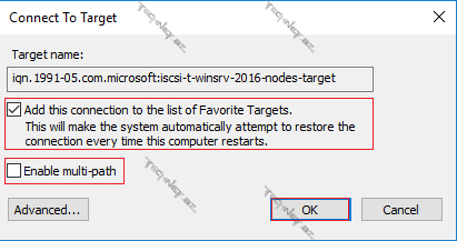 4. Əlavə olaraq diqqətinizə çatdırım ki, Connect düyməsi altında iki əsəs bölmə var. Birinci bölmə bağlantını Favorite Targets bölməsinə əlavə edir və bağlantı zamanı mütləq işarələnməlidir ki, restart zamanı açılışda avtomatik bağlantı təmin olunusun. Digəri isə İSCSİ Storage-ə bir neçə şəbəkə kartı üzərindən bağlandığınz zaman aktivləşdirilməlidir (Öncə MPİO xidməti bütün Nodlarda yüklənib aktivləşdirilməlidir).