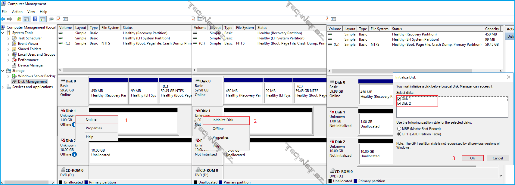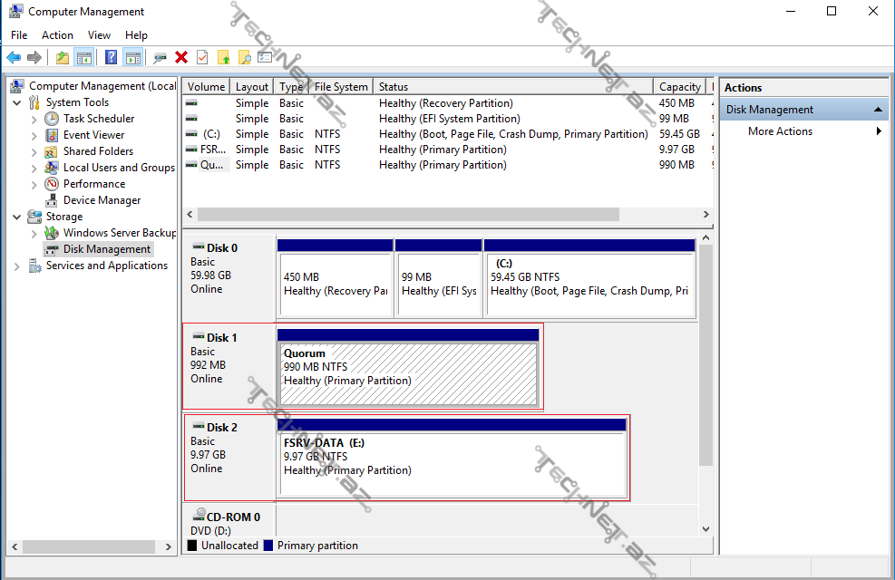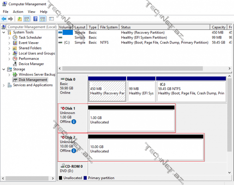 5. Artıq İSCSİ Target Serverə bağlandığımız üçün Nodlar üzərinə disklərin gəldiyini görəcəyik (Yeni Disklər görünməzsə Disk Management – Action-Rescan Disks düyəmsinə sıxmalıyıq).