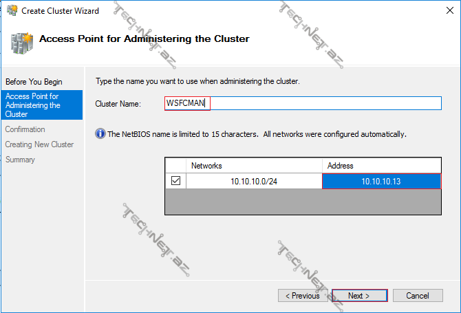 11. Bu addımda Clusteri idarə etmək üçün uyğun ad və ip adersi daxil edirik. Bu bölmədə daxil olunan məlumatlar unikal olmalıdır. Belə təssəvür edə bilərik ki, domainə yeni komputer üzv edirik.