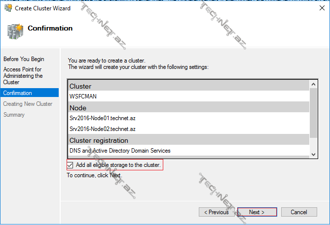 12. Add all eligible storage to the cluster -bölməsini seçərək davam edirik. Bu o anlama gəlirki öncədən hazırladığımız disklər avtomatik olaraq Cluster mühitinə daxil olunacaq və tənzimlənəcək.