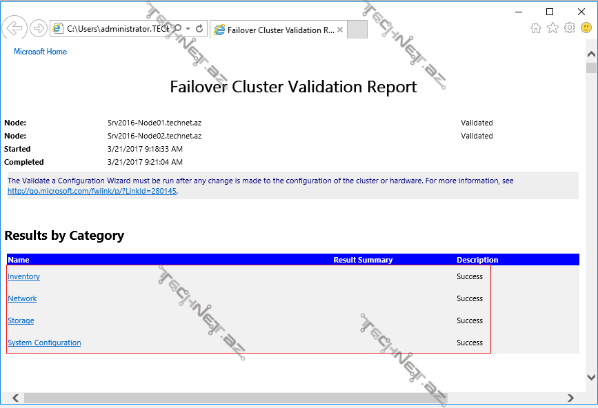 9. Nəticələri analiz edirik. Failover Cluster mühitinin qurulması üçün analiz olunmasına ehtiyac olan resurslar haqqında informasiyanı Reportdan dolğun şəkildə əldə edə bilərsiniz.