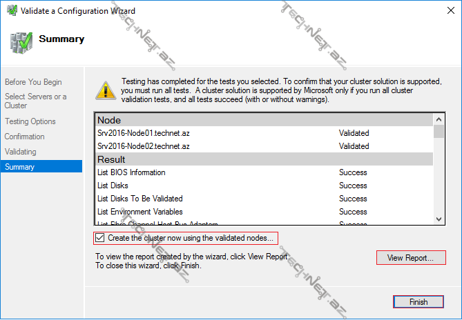 10. Anlazilərdən üzü ağ çıxdığmıza görə 🙂 növbəti addıma keçə bilərik. Əgər ki burda hər hansı bir problem müəyyən olunarsa, həmin problemi həll etdikdən sonra sehirbazın yenidən çalışdırılması məqsədə uyğundur. Create the cluster now using the validated nodes – bölməsini seçərək Finish düyməsi ilə növbəti addıma keçid edirik.