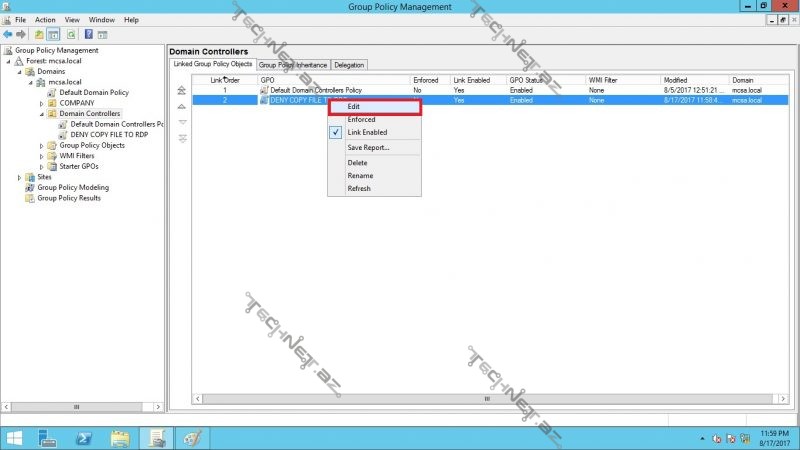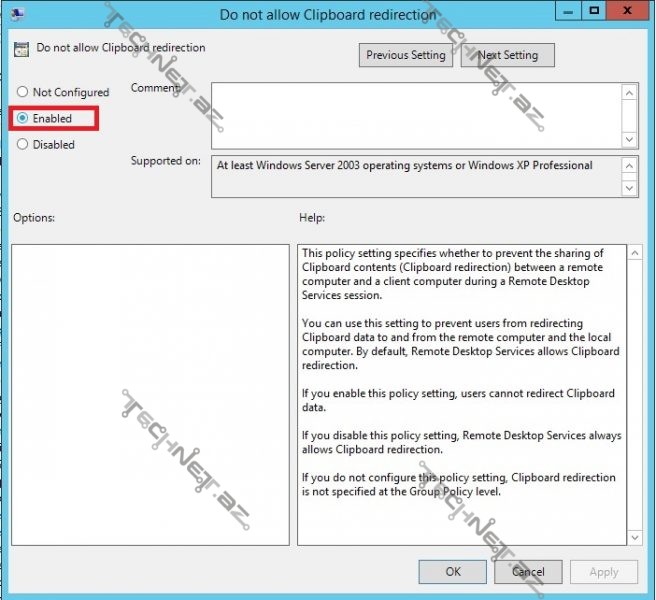Salam dostlar. Bugünki, məqaləmizdə GPO vasitəsilə RDP köməyilə qoşulduğumuz servərə fayıl köçürməyin qarşısını almağı göstərcəyəm. Bəzən olur ki, biz şirkətdə HELPDESK qrupa və yaxud mühasib kimi işçilərə serverə RDP vasitəsilə qoşulmağı icazə veririk, lakin istəmirik ki, icazə verdiyimiz əməkdaşlar serverə hər hansı bir faylı köçürsünlər. Bunun üçün GPO vasitəsilə Server olan OU ya yeni GPO link edirik və GPO üzərində edit sıxıb Computer Configuration/Policies/Administrative Templates/Windows Components/Remote Desktop Services/Remote Desktop Session Host/Device and Resource Redirection “Do not allow Clipboard redirection” Enabled edirik. Serverdə və Qoşulacağmız kompürterdə gpupdate /force edib yoxlayırıq. Mən DC üzərində bunu edəcəm və ona görədə Domain Controller OU üzərində GPO link edəcəm.