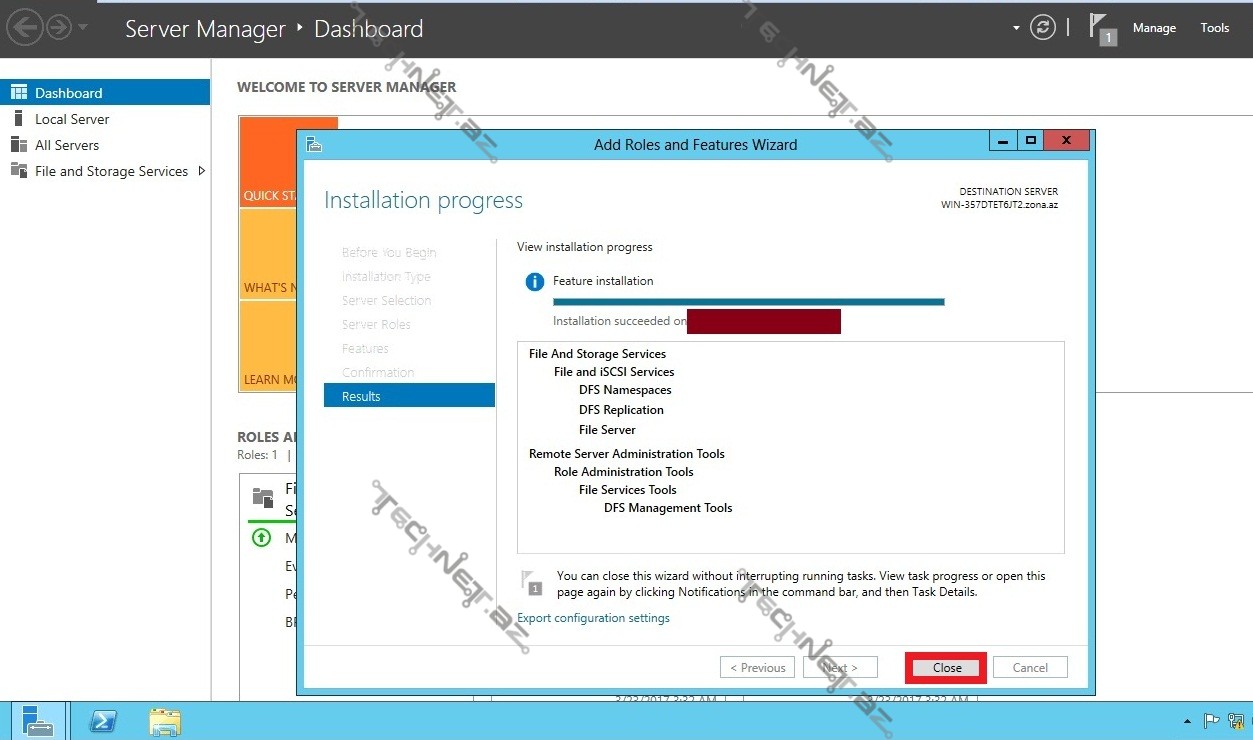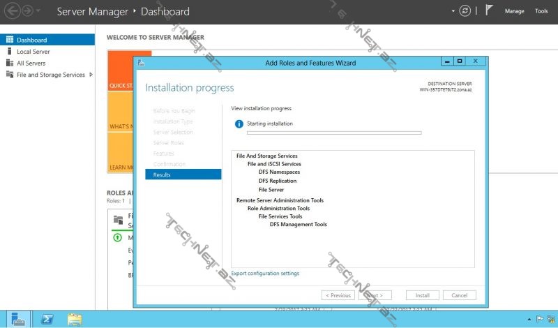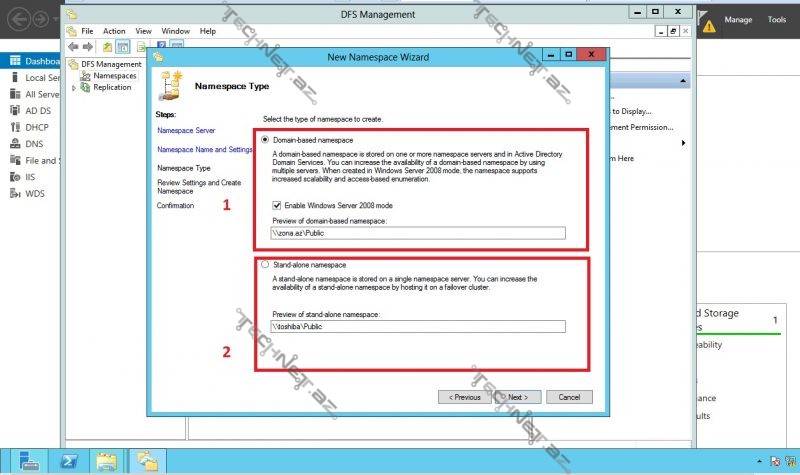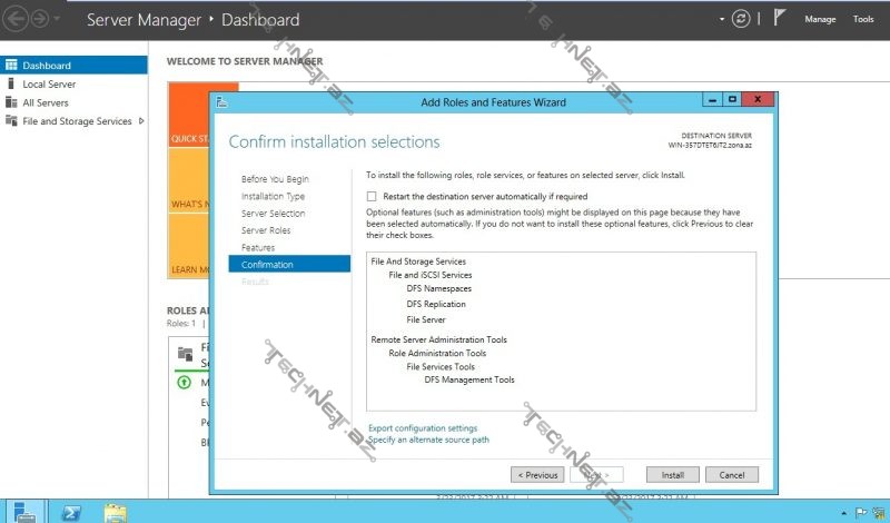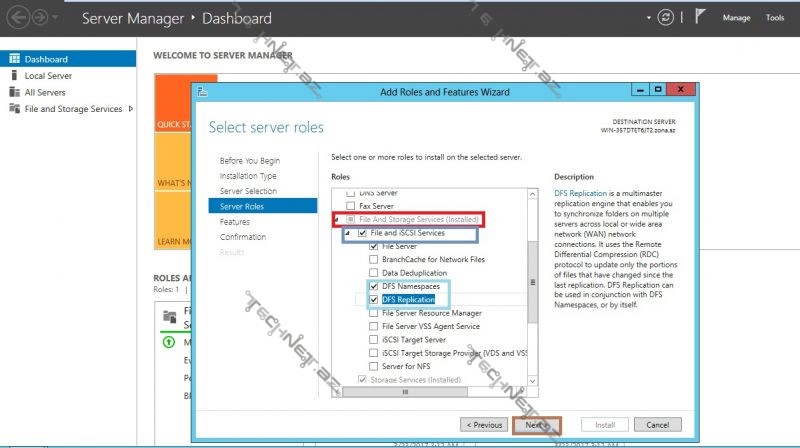 Bu pəncərədə isə şəkildə işarə etdiyim yerlərə daxil olub Dfs namespaces və Dfs replication-a klik edib Next edirik.