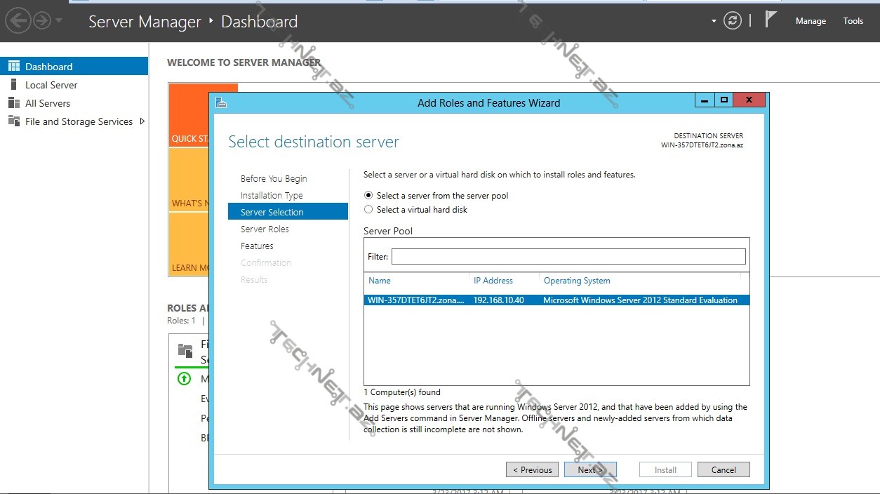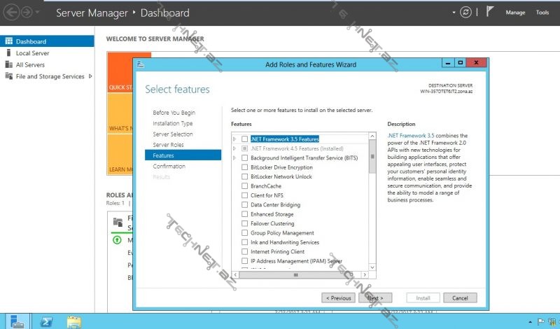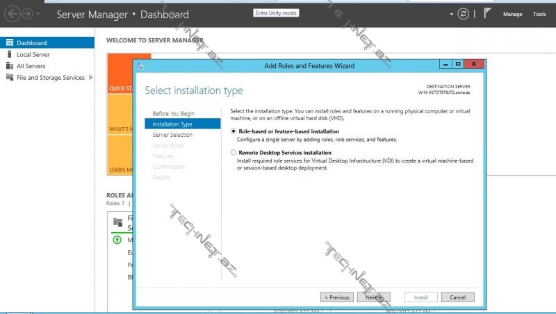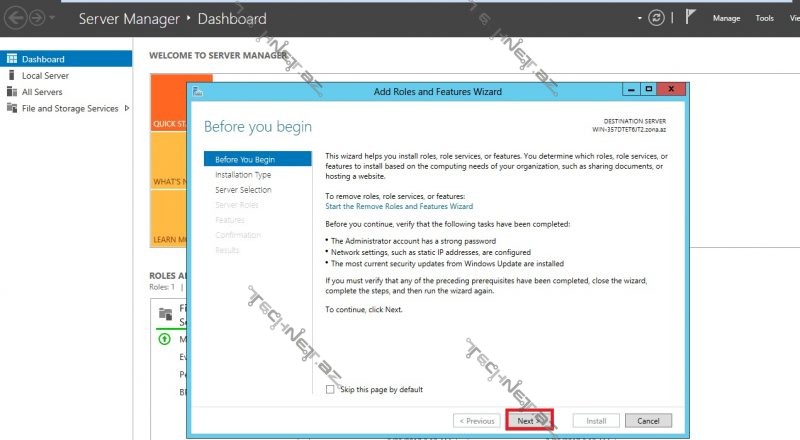 Bunun üçün əsas serverə gəlib Server Manager-ə daxil olub Add roles and features-i klik edirik.