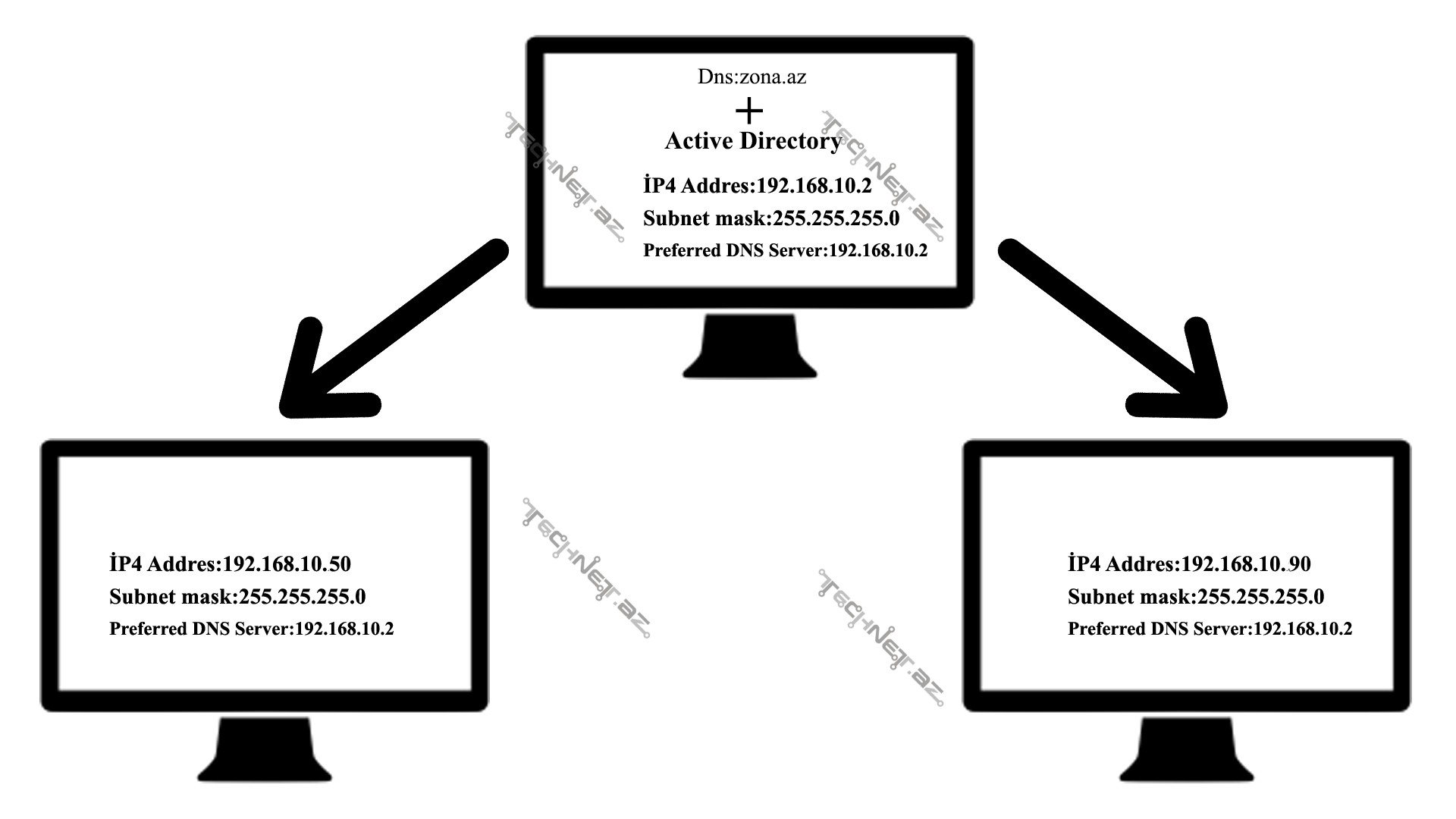 Şəkildə gördüyünüz kimi ən başda bizim əsas serverimiz var. Həm DNS qurmuşuq, həmdə Active Directory digərlərini isə domenə üzv etmişik. İndi isə Dfs-i quraq.