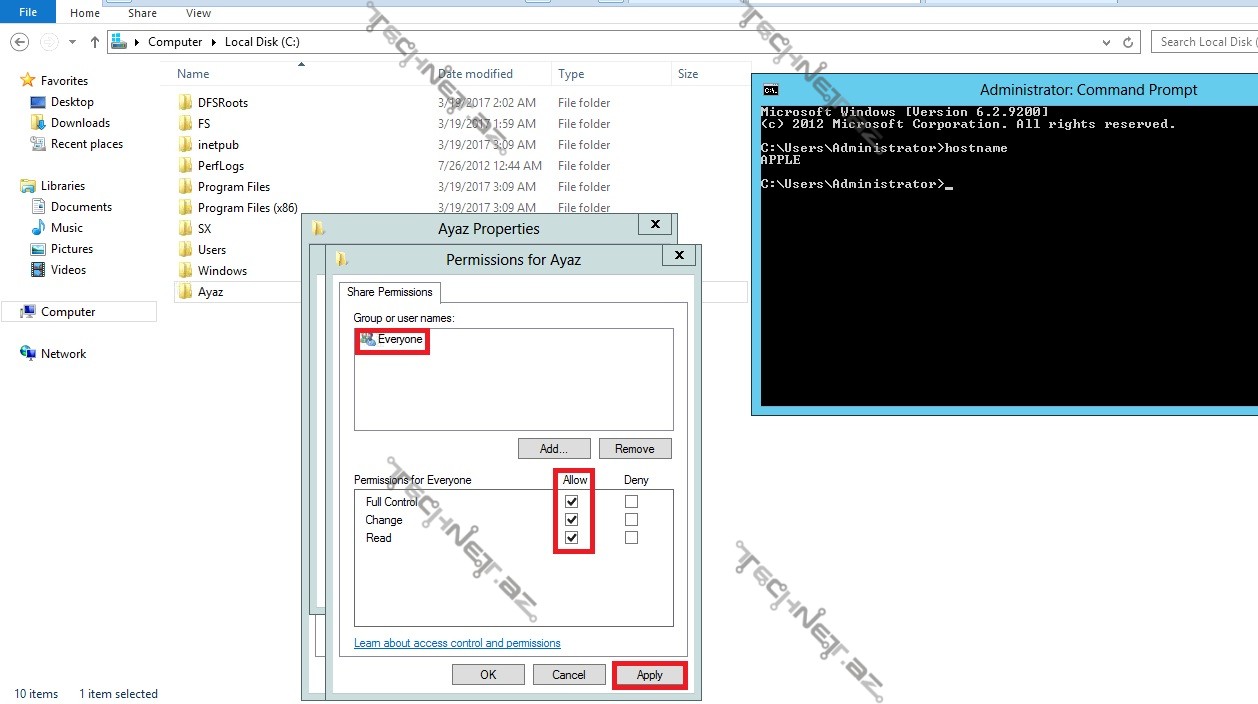 Apple adlı serverə daxil olub Ayaz adlı qovluğu hər kəsə Full control etdib Apply etdik.