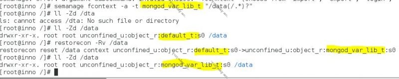 semanage fcontext -a -t mongod_var_lib_t "/data(/.*)?"
