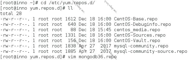 [mongodb36] name=MongoDB Repository baseurl=https://repo.mongodb.org/yum/redhat/$releasever/mongodb-org/3.6/x86_64/ gpgcheck=1 enabled=1 gpgkey=https://www.mongodb.org/static/pgp/server-3.6.asc