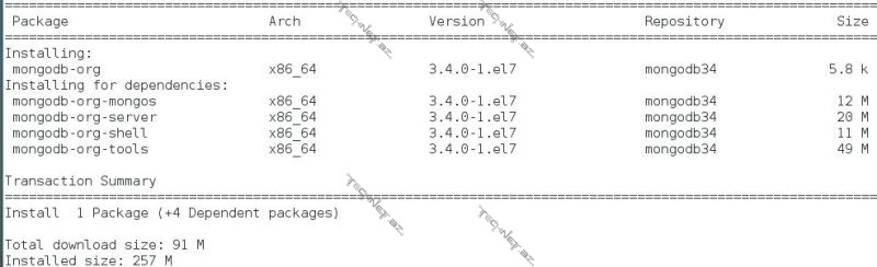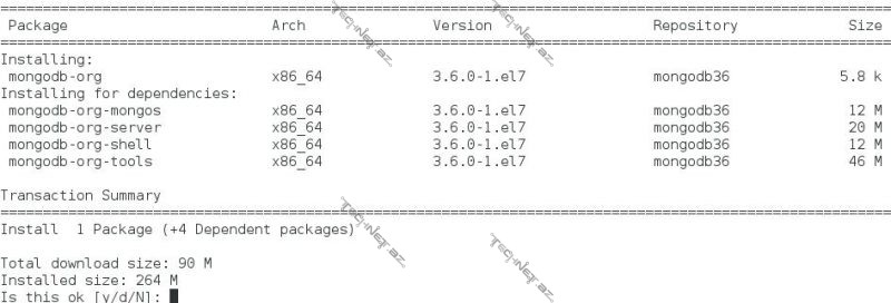 MongoDB-nin qurulması üçün yum install mongodb-org əmrindən istifadə edəcəyik. Bu komanda ilə aşağıdakı paketlər qurulacaq. Əməliyyat sistemində qurulmuş paketlərdən asılı olaraq bu görüntü dəyişik ola bilər.
