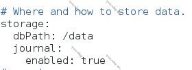 MongoDB servisini start etməzdən öncə /etc/mongod.conf faylına nəzər yetirək. Hal – hazırda bu faylda servisin start edilməsi üçün gərəkli olan ilkin parametrlər qeyd edilib. Bunlardan bizə maraqlı olan storage və systemLog bölmələridir. Storage bölməsində MongoDB data fayllarının hansı qovluqda yerləşəcəyi qeyd edilir. Server yükləndikdə susmaya görə bu /var/lib/mongo qovluğudur. İstəyinizə və tələblərinizə uyğun olaraq dəyişdirilə bilər. Qovluq dəyişdirilərsə yeni dəyər /etc/mongod.conf faylında qeyd edilir və əgər Selinux aktivdirsə uyğun context verilir. Nümunə üçün əgər data qovluğunu /data ilə əvəzləyəriksə aşağıdakı dəyişikliklər edilməlidir.