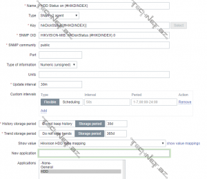 Təbriklər! Artıq ilk “item” yaratdıq. Digər iki itemi (HDD capability on {#HIKDINDEX} və HDD free space on {#HIKDINDEX}) eyni qayda ilə yaradırıq (sadəcə mapping olmadan).