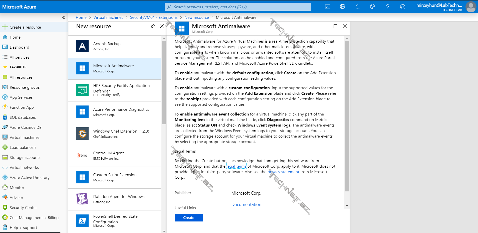 - Microsoft Antimalware extension-u seçərək Create düyməsinə click edin.