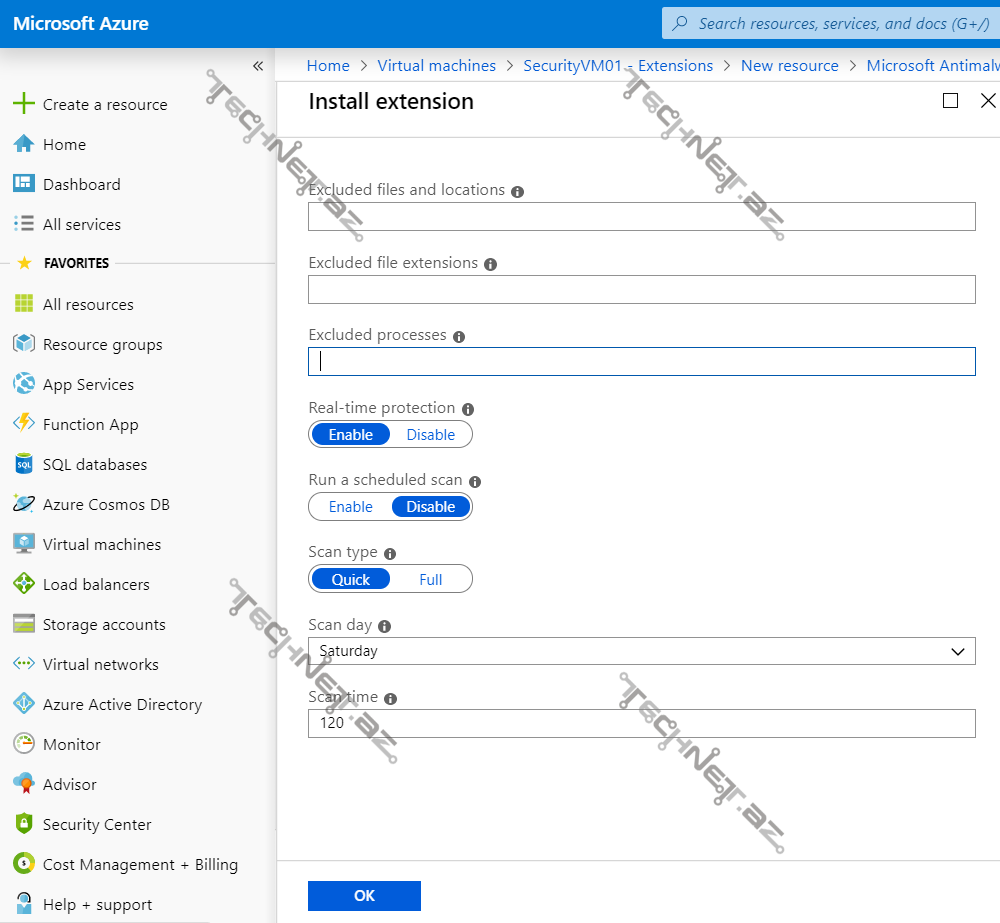 - Açılan pəncərədə yuxarıda qeyd etdiyimiz Antimalware funksiyaların görə bilərik, bu konfiqurasiyaları istəyimizə uyğun modifikasiya edib və ya default olaraq saxalayaraq “OK” düyməsinə click edin.