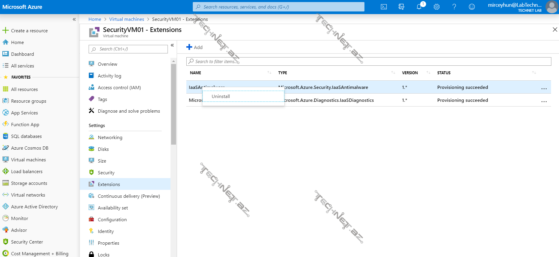 Anti-malware vasitəsini Azure portalını istifadə edərək tez bir zamanda silə bilərsiz. Bunun üçün Antimalware silinməli olan Virtual maşını seçərək, install prossesində olduğu kimi extensions bölümünə daxil oluruq. Burada siz İaaSAntimalware extension-un üzərində sağ düyməni click edərək “Uninstal” edə bilərsiniz.