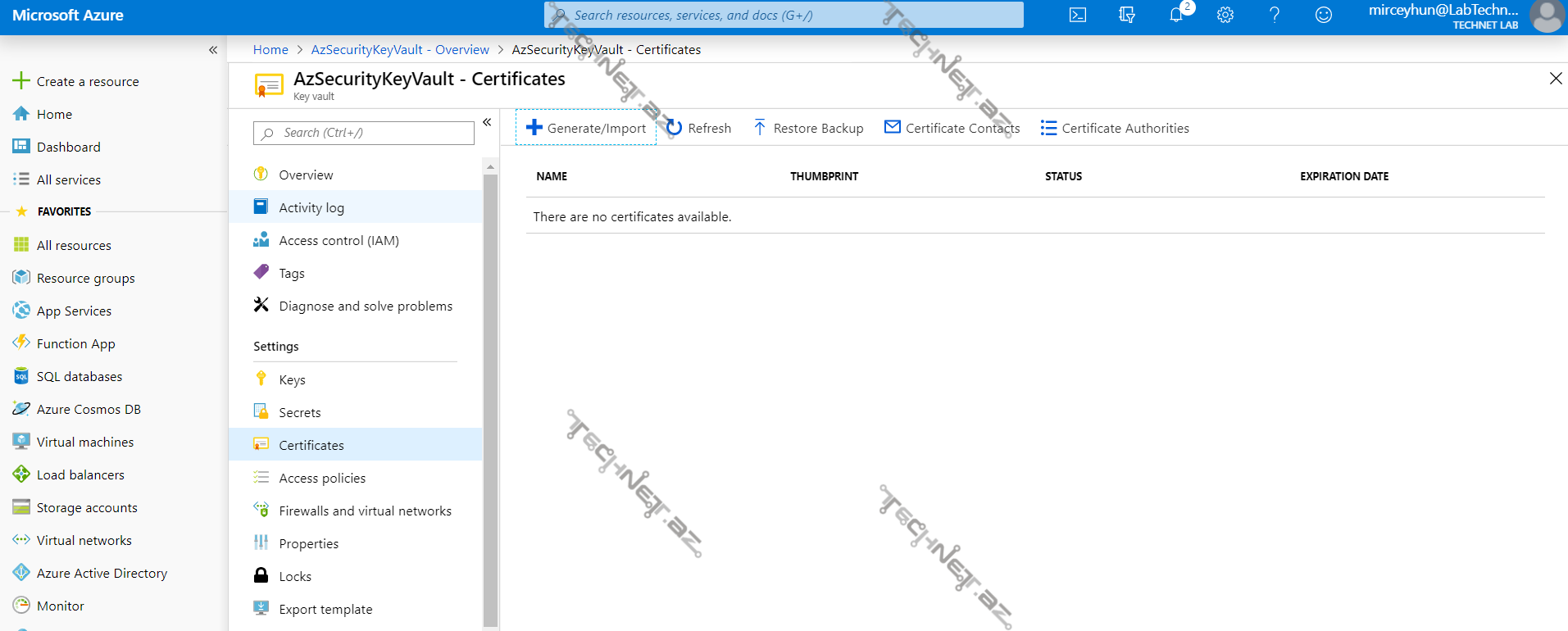 - Key vault-a daxil olaraq, Settings kateqoriyasında yerləşən Certificate bölməsinə daxil olun.