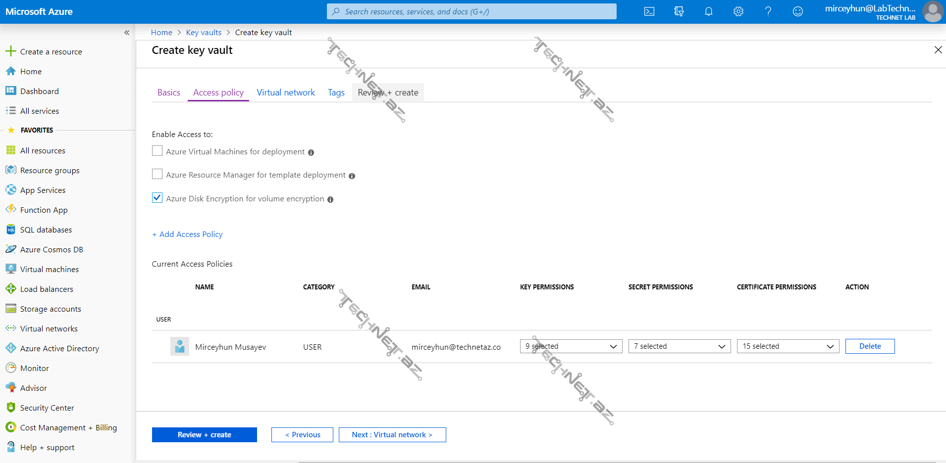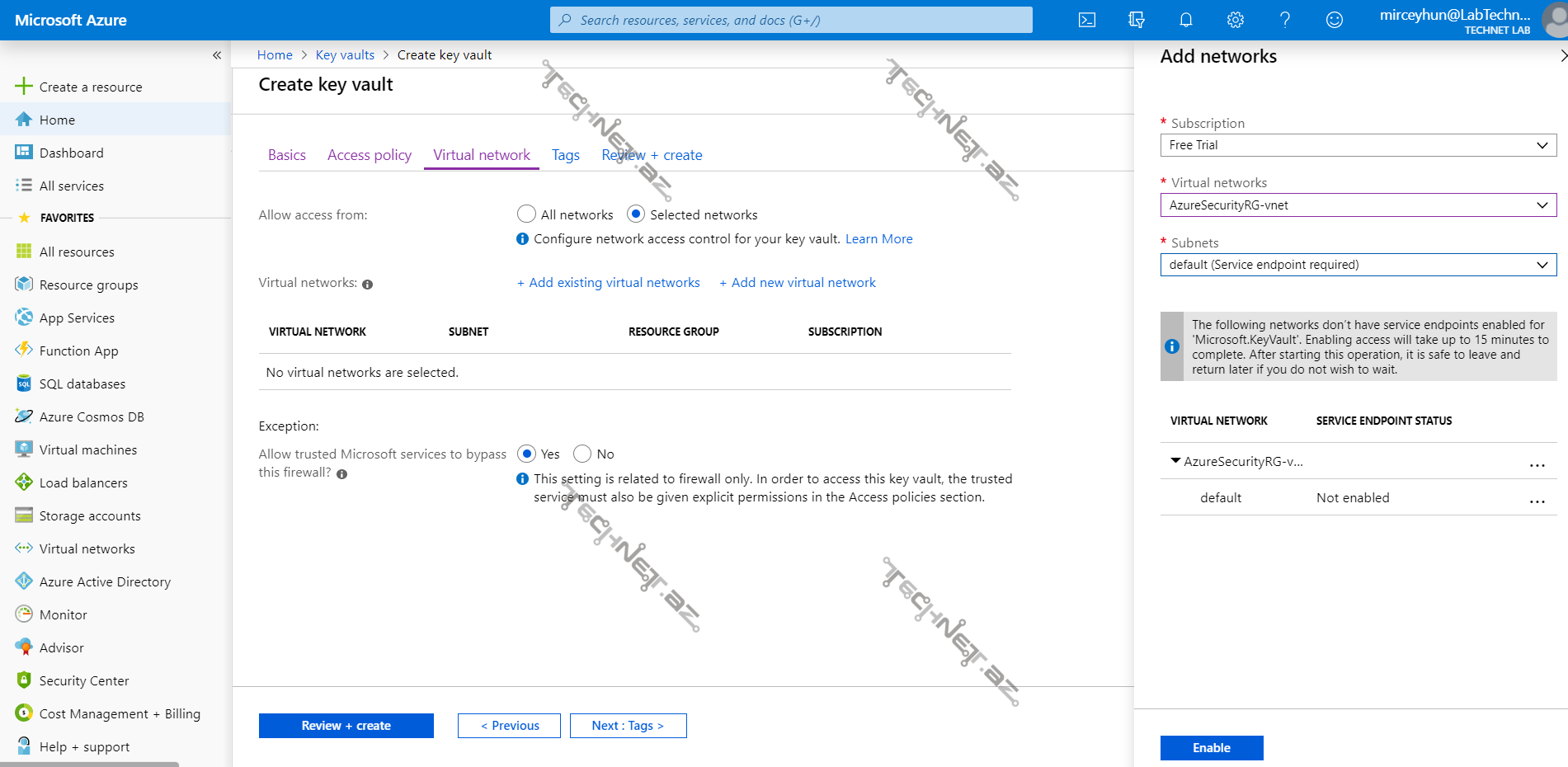 - İstədiyiniz şəbəkəni əlavə etdikdən sonra Enable edin və Review + Create düyməsini basaraq Key Vault-un yaranmasını gözləyin.