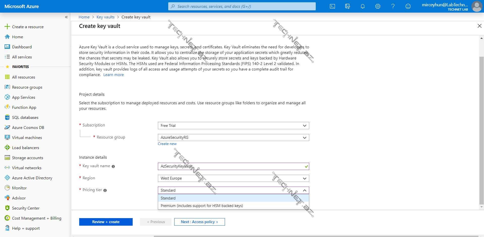 - “Create Key Vault” səhifəsində uyğun parametrləri daxil edin